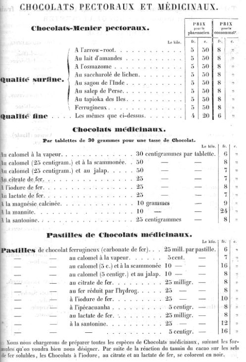 L’entreprise Menier créée par Jean-Antoine Brutus Menier vend des produits pharmaceutiques puis innove en mettant sur le marché des remèdes à base de chocolat. En témoigne les nombreux chocolats médicinaux présents dans le catalogue de l’entreprise.